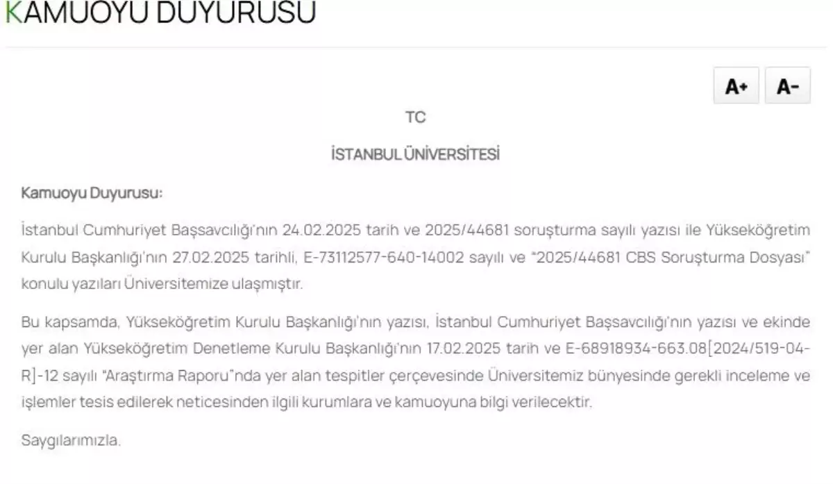 İstanbul Cumhuriyet Başsavcılığı, İstanbul Büyükşehir Belediye (İBB) Başkanı Ekrem İmamoğlu’nun lisans diplomasının sahte olduğuna ilişkin ihbarlar ve Yükseköğretim Kurulunca hazırlanan raporda diplomasının sahteliğine ilişkin tespitler üzerine, “resmi belgede sahtecilik” suçundan soruşturma başlatmıştı. İstanbul Üniversitesi, İBB Başkanı İmamoğlu’nun üniversite diplomasının sahte olduğu iddiasına ilişkin yapılan açıklamada, “İstanbul Cumhuriyet Başsavcılığının 24 Şubat 2025 tarih ve 2025/44681 soruşturma sayılı yazısı ile Yükseköğretim Kurulu Başkanlığının 27 Şubat 2025 tarihli ‘Soruşturma Dosyası’ konulu yazıları üniversitemize ulaşmıştır. Bu kapsamda, Yükseköğretim Kurulu Başkanlığının yazısı, İstanbul Cumhuriyet Başsavcılığının yazısı ve ekinde yer alan Yükseköğretim Denetleme Kurulu Başkanlığının 17 Şubat 2025 tarihli ‘Araştırma Raporu’nda yer alan tespitler çerçevesinde üniversitemiz bünyesinde gerekli inceleme ve işlemler tesis edilerek, neticesinden ilgili kurumlara ve kamuoyuna bilgi verilecektir” ifadelerine yer verildi. – İSTANBUL